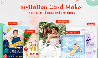 该应用程序有一个专门的生日邀请卡部分,用户可以从各种主题中选择,例如动画电影卡通人物、男孩的第一个生日、男人王子、女孩公主主题等。该应用程序还允许用户使用保存日期卡格式创建独特的婚礼邀请设计。用户可以选择经典、现代、时尚和印度婚礼邀请设计。此外,用户还可以创建婴儿派对邀请和虚拟贺卡,以祝福他们所爱的人在节日、活动、婚礼和生日祝福中带上引用语。